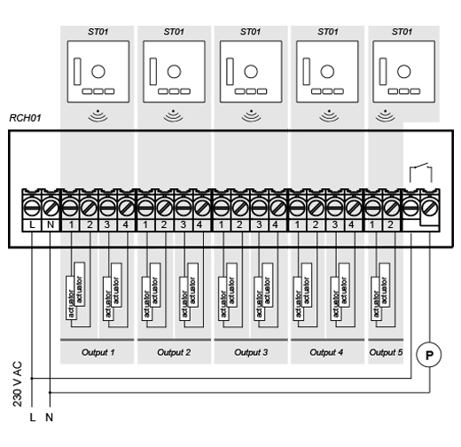The RCH01 is a wireless controller for underfloor heating circuit manifolds.