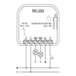 The bidirectional RCJ33 flush-mounted receiver is designed for switching low-voltage devices with a potential-free changeover contact.