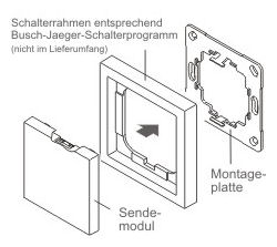 Der Sender ist kompatibel zum Busch-Jaeger-Schalterprogramm. Das Sendemodul wird mit der gewünschten Wippe kombiniert, einfach in den Schalterrahmen geklickt und ist sofort funktionsfähig. Die Montage auf der Wand erfolgt wahlweise mit Klebepads oder Schrauben.